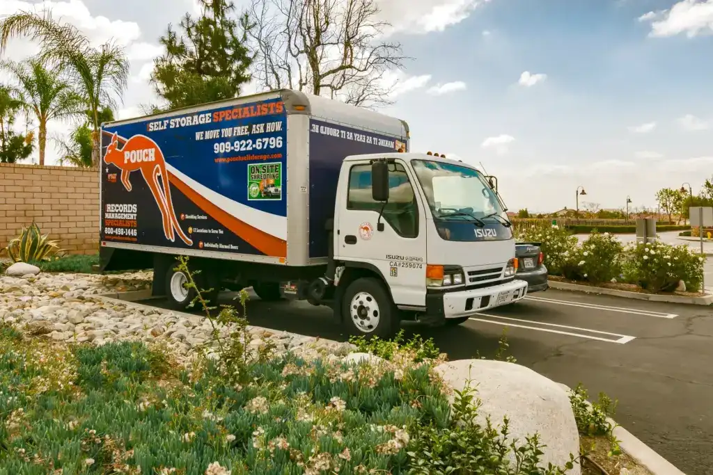We pick up your Goods (in the Service Area) in our truck delivering them to your rented Pouch Self Storage space. You load & unload your Goods from the “We Move You Free” truck. Our goal is to make your moving experience easier by providing free tools to assist your moving process.
